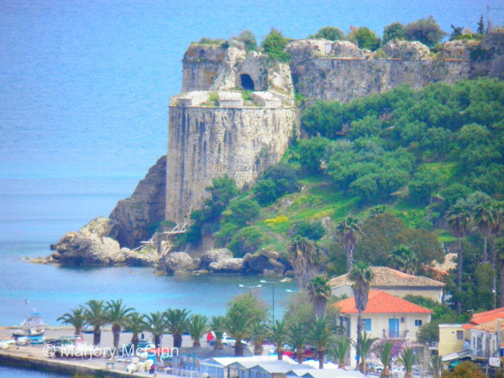From top: The view of the Messinian Bay looking north from ‘Ayia Pelagia’; the huge bulwark of Koroni Castle; Marjory, Jim and Wallace at Koroni harbour; view from the castle over the harbour; Ayia Triada beach, one of the leading locations of the novel.