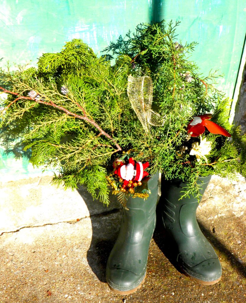 Whenever she came inside after that, her quizzical eyes strafed the room, doing a kind of mental inventory, but to her credit she never remarked on the adjustments. Meanwhile, with a developing artistic flair, she set about making countless Christmas wreaths wound through with fruit, veg and other Magpie finds, decorating everything from cat flaps to clapped-out welly boots, as pictured, top.